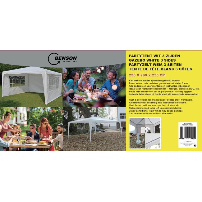 Benson partytent 3 zijden 290 x 290 x 245 cm. Stevig frame en waterafstotend dak. Perfect voor tuinfeest, barbecue, camping of markt. Lees meer.
