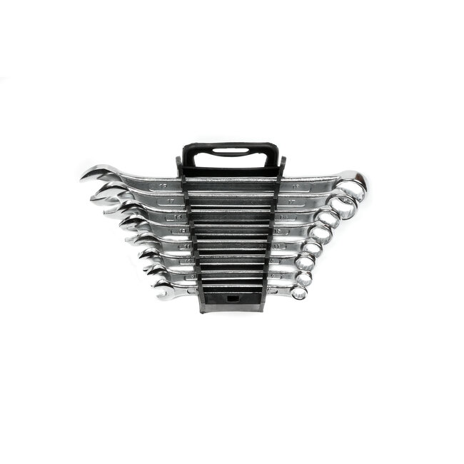 De sleutels zijn vervaardigd uit chroom-vanadiumstaal en hebben een verchroomde en gepolijste afwerking, wat zorgt voor een lange levensduur en een professionele uitstraling. De set bevat veelgebruikte maten van 8 tot 19 mm, zodat je altijd de juiste sleutel bij de hand hebt. Dankzij de meegeleverde houder blijven de sleutels netjes georganiseerd en overzichtelijk opgeborgen in je gereedschapskist.