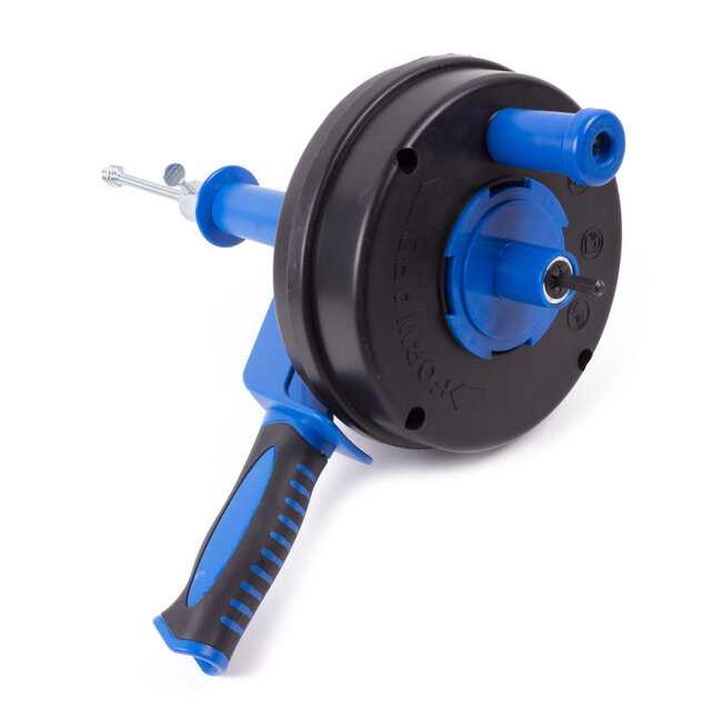 De rioolveer is voorzien van een veer-uit-stand vergrendeling, waarmee u de kabel veilig en gecontroleerd kunt gebruiken. Bij gebruik met een boormachine bedraagt het maximale toerental 200 omwentelingen per minuut, wat zorgt voor krachtige, maar gecontroleerde reiniging van leidingen.