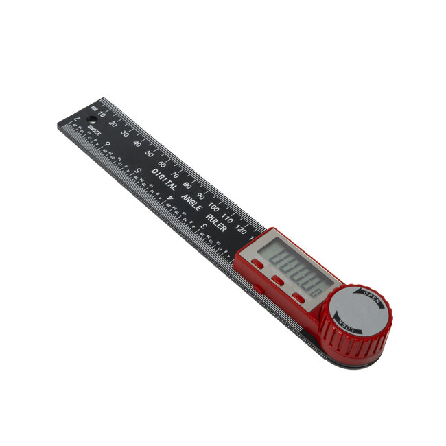 Deze digitale hoekzoeker is voorzien van metrische en inch schaalverdelingen op beide zwaaihaken, en kan nauwkeurig worden ingesteld in stappen van 0,1°. Het LED-display toont direct de gemeten hoek en biedt handige functies zoals HOLD, waarmee de laatste meting wordt opgeslagen. Met de D/M-knop kan eenvoudig worden gewisseld tussen decimale graden en graden/minuten, terwijl de vergrendelbare linialen via de grote rode draaiknop voor stabiliteit tijdens het meten zorgen.