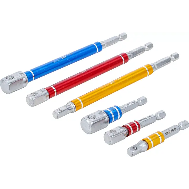 BGS adapterset 1/4" voor boormachines, 6-delig. Met 75 en 150 mm adapters voor 1/4", 3/8" en 1/2" dopsleutels. Lees meer.