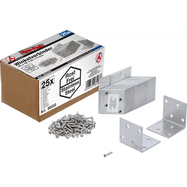 De BGS Hoekverbinder – roestvrij staal, 40 x 40 x 40 mm is een veelzijdige en duurzame oplossing voor het verbinden van houten onderdelen in lichte tot middelzware constructies. Deze voordeelverpakking van 25 stuks biedt een kostenefficiënte manier om meerdere projecten tegelijk uit te voeren.