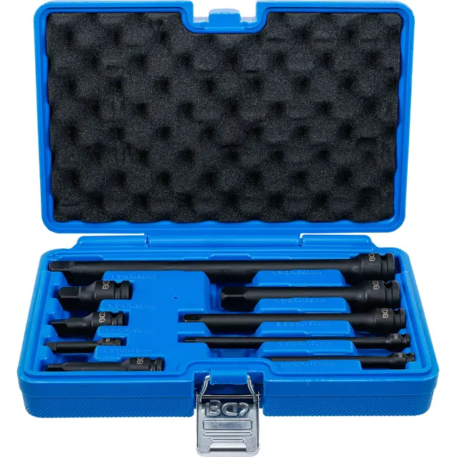 BGS Kracht verlengstukset 9-delig – 1/4", 3/8" en 1/2" – chroom-molybdeen-staal, diverse lengtes, veilig in kunststof koffer, voor hand- en accu-slagmoersleutels. Lees meer.