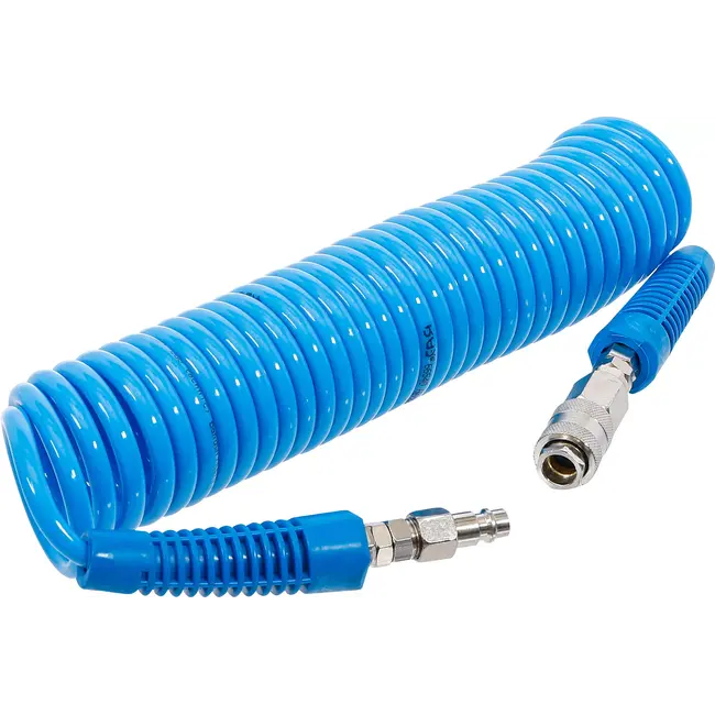 Flexibele PU-luchtspiraalslang van 6 m met knikbeveiliging en draaibare, verwisselbare koppelingsadapters. Compact, duurzaam en geschikt voor persluchtsystemen tot 10 bar. Lees meer.