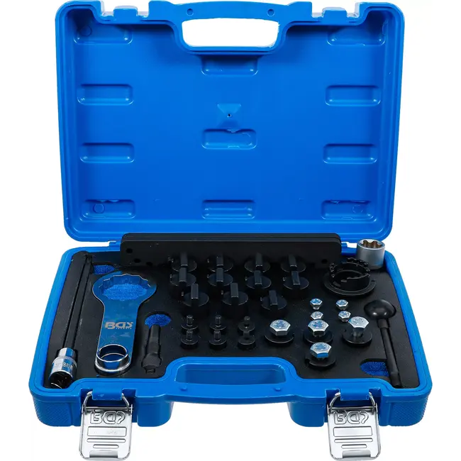 De set bevat alle benodigde gereedschappen voor het fixeren van nokkenassen en krukas, evenals speciale tools voor het blokkeren en afstellen van de nokkenasverstellers. Hierdoor is de set ideaal voor werkzaamheden zoals distributiekettingvervanging, cilinderkopreparaties en motoronderhoud.
