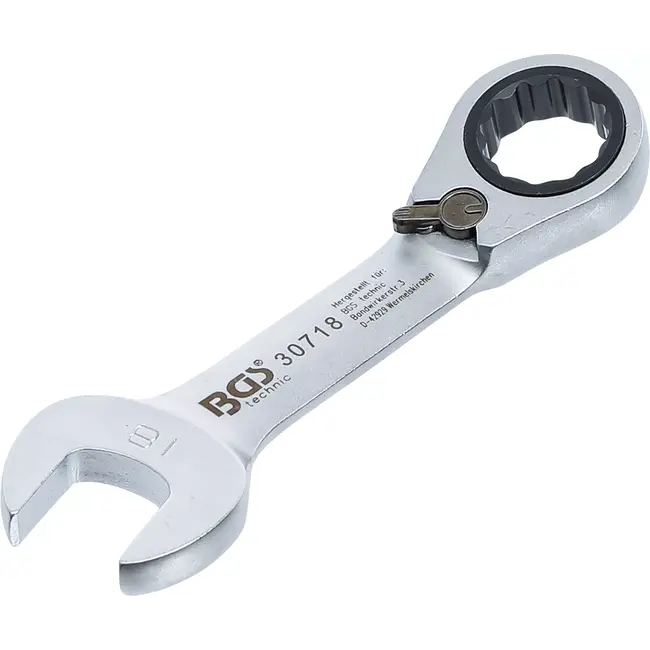 BGS Ratel ringsteeksleutel – kort – 18 mm, omschakelbaar, 72 tanden. Compact, duurzaam chroom-vanadium-staal met mat verchroomde afwerking voor krap werk. Lees meer.