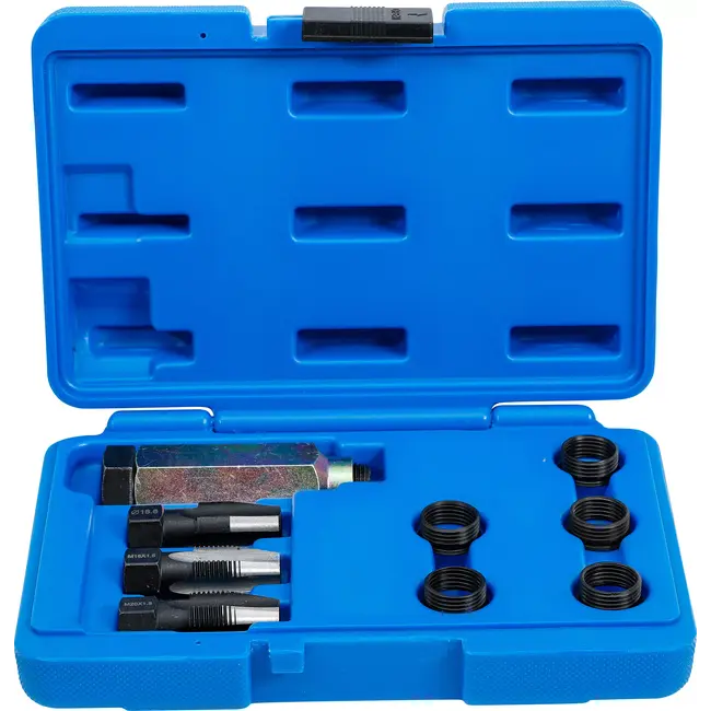 Met het speciale gereedschap voor het invoeren van de reparatiebussen wordt correcte montage eenvoudig en nauwkeurig voltooid. De set wordt geleverd met 5 reparatiebussen, zodat meerdere schroefdraden kunnen worden gereviseerd.