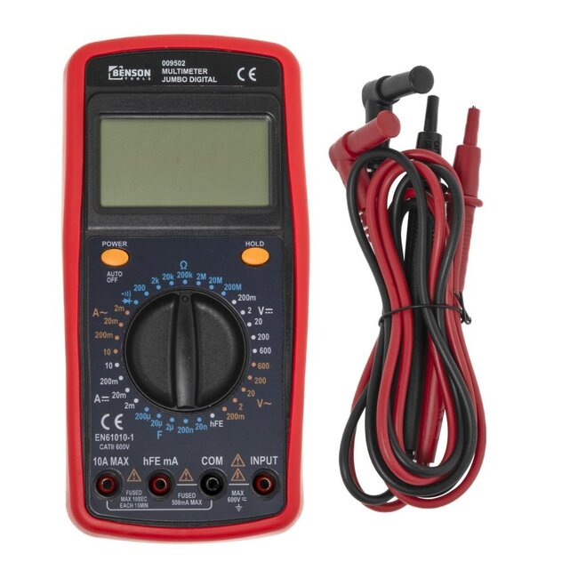 3 1/2 digit digitale multimeter voor het meten van: wissel en gelijk spanning en stroom, weerstand, Capaciteit, diode doorlaat spanning met pieper en LED indicator, transistor hfe meting. Wordt geleverd met 9 volt batterij meetsnoeren en rubber beschermrand. Uitklapbaar voetje om de meter schuin te kunnen neerzetten. Afmetingen: 20 X 9 cm, lengte meetsnoeren:70 cm