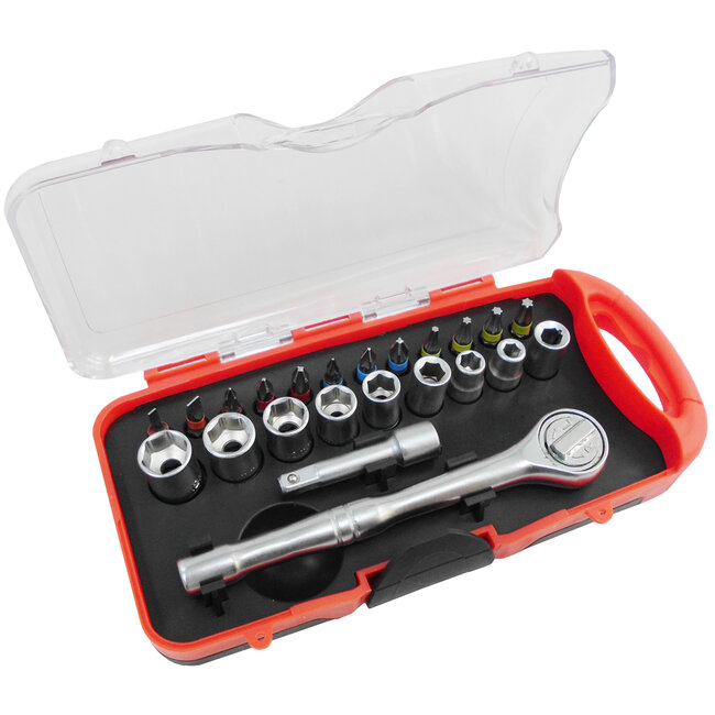 Compacte 23-delige set inclusief omkeerbare ratel met 43 tanden. Bevat 8 doppen en 12 bits van hoogwaardig chroom-vanadium staal in een kunststof koffer. Lees meer.